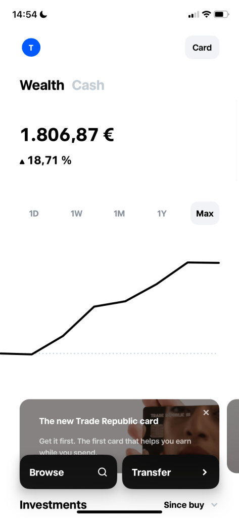 我在今年初總算正式下定決心開始要更積極的投資,此前的投資只有在台灣保險公司的定投基金,但我開始想要買更高投資報酬率的產品,於是開始在網路上查了一下大家在德國投資都使用了什麼平台,結果發現像是Trade Republic, Comdirect, Scalable Captial等等都有人用,但最多人分享使用的還是Trade Republic,於是就開戶了:)
