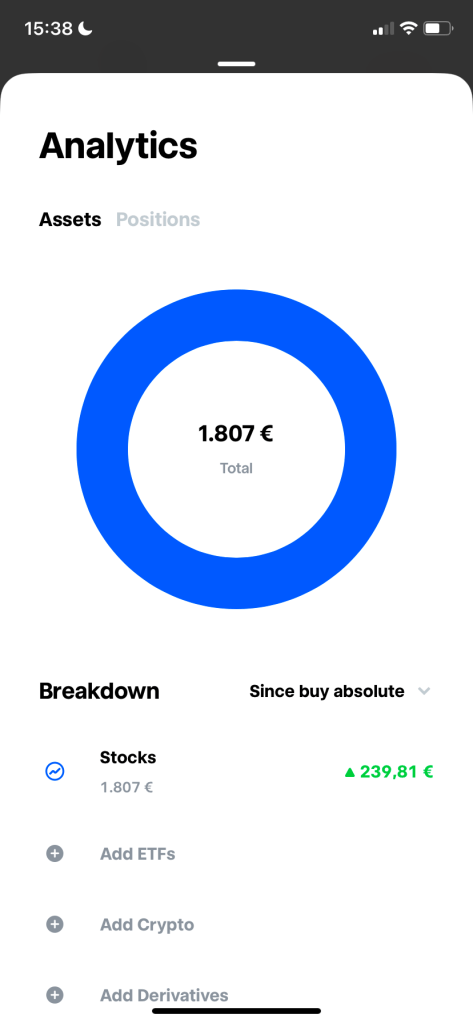 Trade Republic 的投資選擇有很多,像是股票、ETFs、加密貨幣、衍生性金融商品(Derivatives)、債券都有,而我目前主要的投資主力還是以美股為主。在Wealth介面你就可以輕鬆看到目前的投資成果,在Analytics部分也可以看到你目前總共賺/賠了多少。